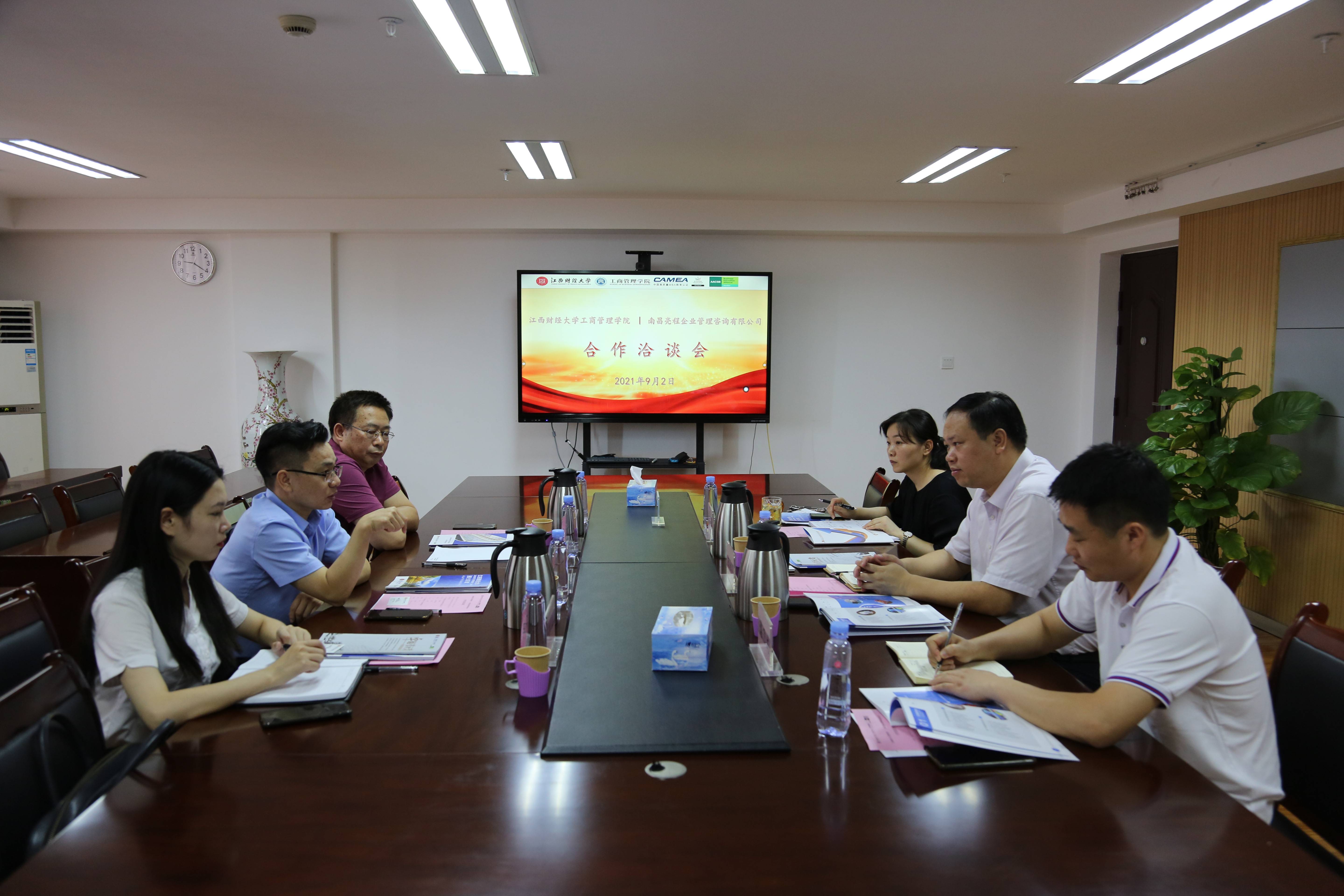 秋高气爽,天高云淡。正值新学期开学之际,9月2日,南昌亮程咨询集团董事长毛大兵、集团高级顾问刘桂江、董事长助理丁卫等一行赴江西财经大学工商管理学院,与院长胡海波、副院长谌飞龙及党政办主任许丽艳等洽谈战略合作事宜。